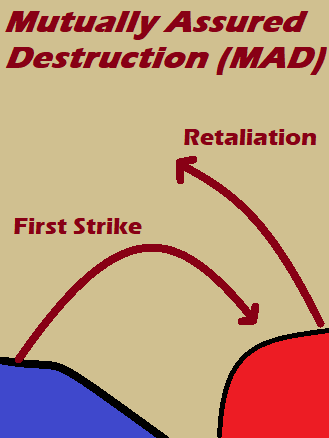- If either side initiates a first strike, then the other retaliates, with near-complete destruction suffered by both sides that makes initiating a first strike unthinkable.